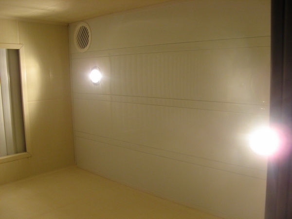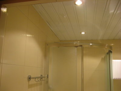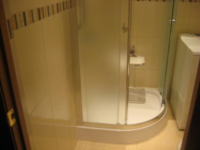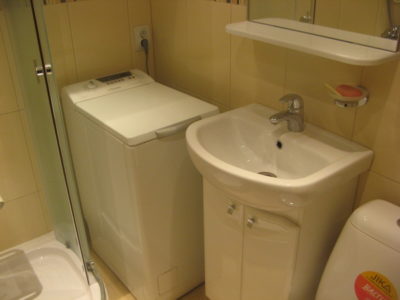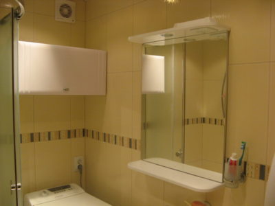 Наша компания выполнила ремонт санузла в квартире на улице Рудневка. Для облицовки стен мы выбрали однотонную керамическую плитку бежевого цвета, а для оформления потолка пластиковые панели. На пол уложен кафель с горизонтальным рисунком в тон общему интерьеру. Несмотря на малую площадь помещения, нам удалось компактно разместить в нем душевую кабину, стиральную машину вертикального типа, мойдодыр на две створки и унитаз. На боковых стенах установлен подвесной шкаф и вмонтированы крючки для полотенец. Для освещения в потолок встроены точечные светильники. Смета на ремонт — 113 тысяч рублей. На черновые материалы ушло 34 тыс. руб.
