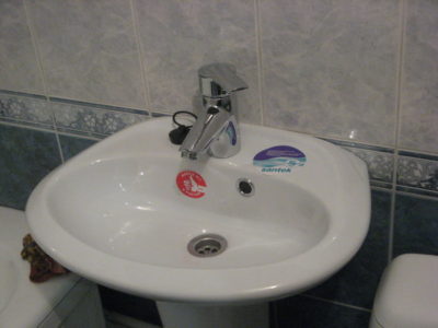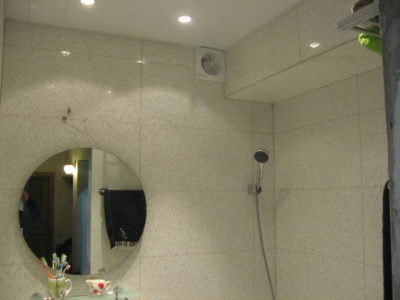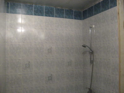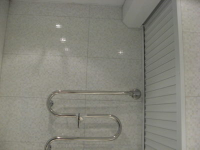 Наша компания выполнила ремонт 2 совмещенных санузлов на улице Салтыковская. Стены облицованы керамической плиткой нежно-голубого оттенка и цвета морской волны. Между контрастной отделкой выложена фреза с цветочным рисунком. На пол уложен кафель в тон общему интерьеру. В комнате установлены ванна с гибким душем, умывальник модели «Тюльпан», унитаз и полотенцесушитель. Инженерные коммуникации скрыты за вертикальными жалюзи, а полость под ванной — экраном с раздвижными дверками. Потолок оформлен пластиковыми панелями. Бюджет ремонта на один санузел составил 117 тысяч рублей. Черновые материалы — 30 тыс. руб.