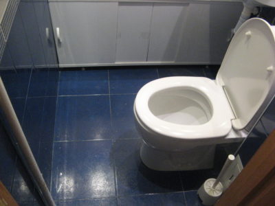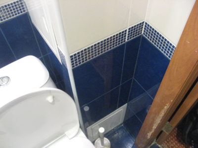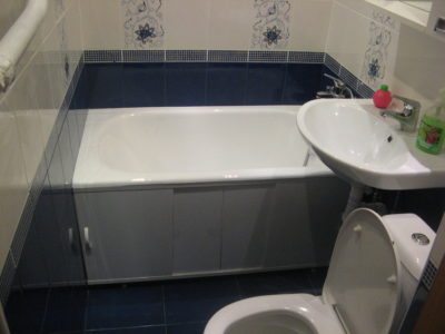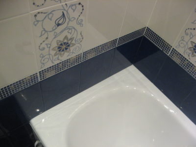 Капитальный ремонт совмещенной ванной и туалета на улице 2 Рощинская занял 22 дня. Мастера полностью демонтировали коммуникации, сняли старую отделку со стен и напольное покрытие. На пол была уложена новая стяжка и синяя плитка, стены облицованы кафелем белого и темно-синего цвета, а потолок декорирован подвесной реечной конструкцией. Для придания комнате нарядного вида над ванной выложен вертикальный узор с цветочным принтом и золотым тиснением. С правой стороны от входа установлены унитаз и подвесной умывальник, над которым мы смонтировали зеркало с боковым шкафом и дополнительными светильниками. Цена ремонта – 98000 рублей. На черновые материалы ушло 31 тыс. руб.