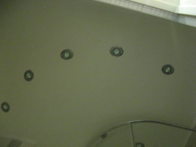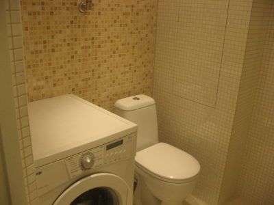 Наша компания выполнила капитальный ремонт совмещенного с ванной комнатой санузла на улице Новочеремушкинская. Для декорирования поверхностей дизайнер выбрала мозаичную плитку двух видов: однотонную и цветную. Благодаря правильно подобранному расположению сантехники малогабаритное помещение выглядит просторным, а за счет теплых оттенков плитки – уютным. В санузле мастера установили полукруглую душевую кабину со стеклянными дверцами и рукомойник с тумбой с правой стороны от входа, а компактный унитаз, полотенцесушитель и стиральную машину – с левой. В подвесной потолок вмонтированы точечные светильники, а на пол уложен кафель светло-бежевого цвета. Цена ремонта – 126 тысячи рублей. Стоимость черновых материалов – 32 тыс. руб