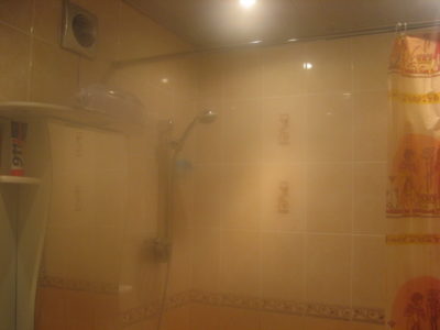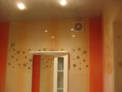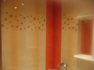 При выполнении ремонта санузла на Варшавском шоссе были использованы яркие отделочные материалы сочного оранжевого и нежного кремового цветов. Эксклюзивности интерьеру придает декоративный орнамент по верхней верхней части стены. Потолок оформлен пластиковыми панелями с вмонтированными точечными светильниками. Нетрадиционным решением стала установка складного полотенцесушителя. Акриловая ванна зашита экраном с дверцами, смонтирован умывальник с тумбой, укомплектованной стеклянными фасадами, а также установлен унитаз стандартной модели. Стоимость ремонта — 124000 руб. Цена черновых материалов — 30890 р.