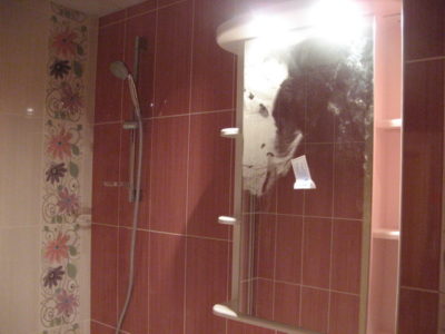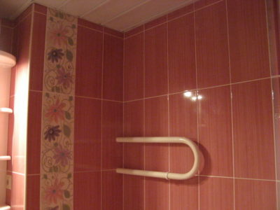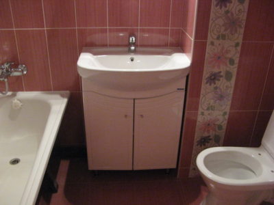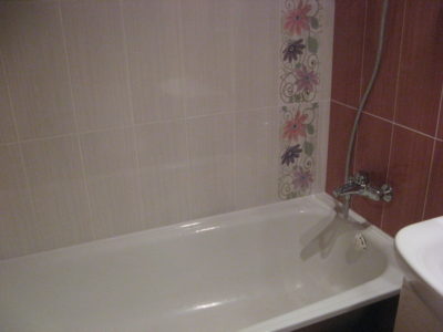 Наша компания выполнила ремонт санузла в городе Видное на улице Школьная. Для облицовки стен мы использовали керамическую плитку нестандартной удлиненной формы бордового и кремового цветов. Такое сочетание позволило зрительно разделить помещение на функциональные зоны. Для нарядности мы выложили вертикальный узор с цветочным орнаментом в двух местах. На пол уложили керамические плиты в тон общему интерьеру. Потолок оформлен пластиковыми панелями. Смонтированы новая ванна с гибким душем, унитаз и мойдодыр с зеркалом. Смета на ремонт составила 98 тысяч рублей. Цена черновых материалов — 31 тыс. руб.