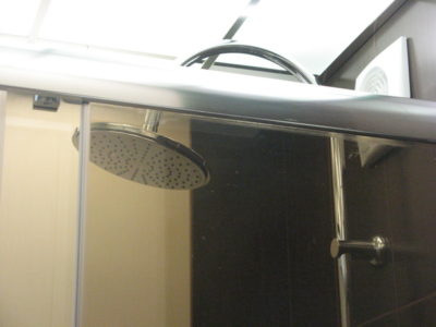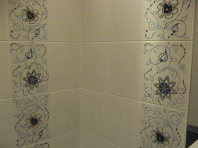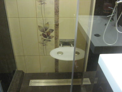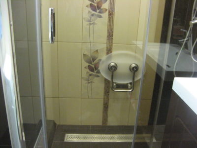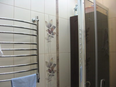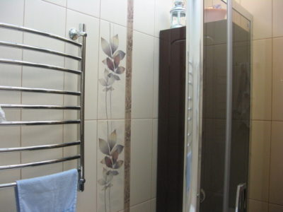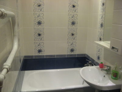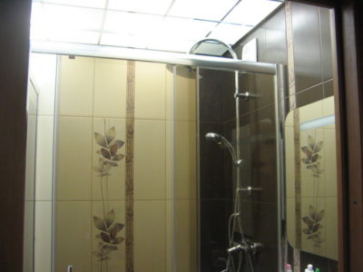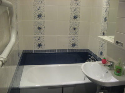 Визуально помещение разделено на несколько функциональных зон. Для оформления душевого уголка использовались металлический профиль, прозрачные раздвижные шторы и коричневая облицовочная плитка. Остальные поверхности в районе ванны и умывальника облицованы плиткой бежевого и синего цветов.