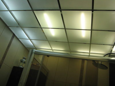 Особой роскоши интерьеру придают вертикальные декоративные панно и подвесной потолок. За прозрачными панелями скрыты светодиодные светильники.