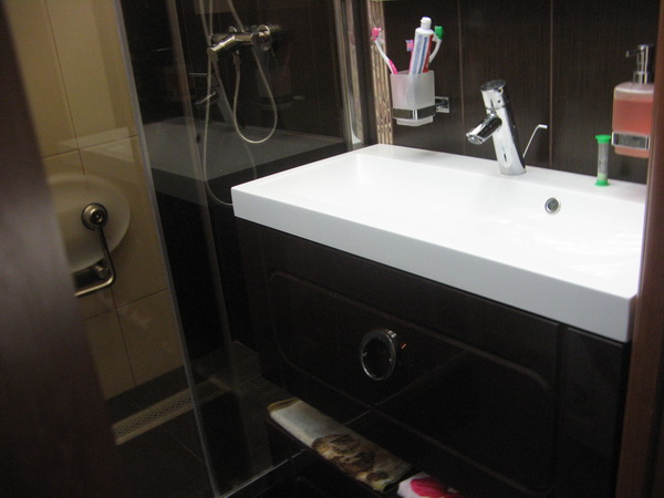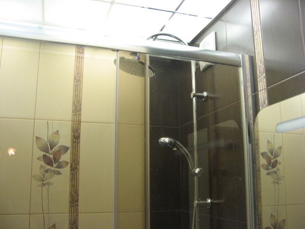 Визуально помещение разделено на несколько функциональных зон. Для оформления душевого уголка использовались металлический профиль, прозрачные раздвижные шторы и коричневая облицовочная плитка. Остальные поверхности в районе ванны и умывальника облицованы плиткой бежевого и синего цветов.