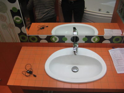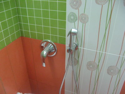 В ходе ремонта совмещенного санузла на улице Тверская мы полностью переоборудовали помещение и разделили комнату на несколько обособленных зон. Подвесной унитаз с душем-биде спрятан за небольшой низкой перегородкой, имитирующей кирпичную кладку, а умывальник установлен прямо у входа и выполнен в виде столика с вмонтированной в столешницу мойкой. Угловую часть помещения занимает габаритная душевая кабина без крыши. Изюминки интерьера: зеркальный потолок, изготовленный из квадратных плиток, яркие цвета, сочные принты и стильная подсветка по всему периметру санузла. Стоимость ремонта – 127 тыс. 500 руб. Черновые материалы обошлись в 34000 руб.