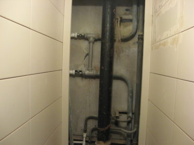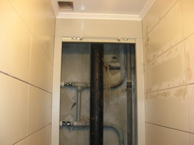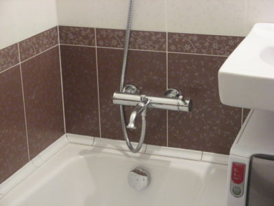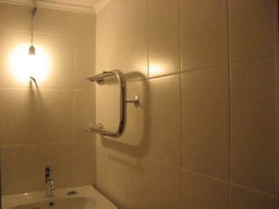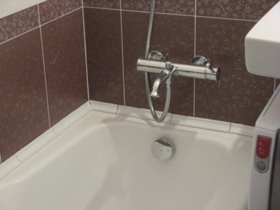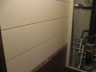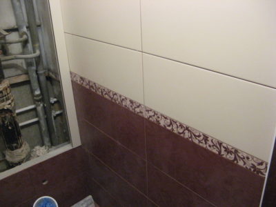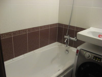 Наша компания выполнила ремонт ванной комнаты и туалета на улице Часовой. Для облицовки стен в обоих помещениях использовалась керамическая плитка белого и бордового цвета с мелким цветочным рисунком. В ванной комнате установлена акриловая ванна, полость под которой скрыта за распашными дверцами. Рядом расположена стиральная машина, а над ней смонтирован навесной умывальник. В туалете позади унитаза мы замаскировали инженерные коммуникации при помощи вертикальных жалюзи. Общая смета ремонта — 126000 рублей. Цена черновых материалов — 35 тыс. руб.