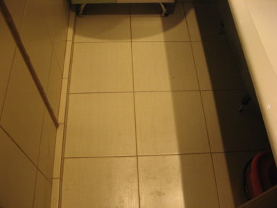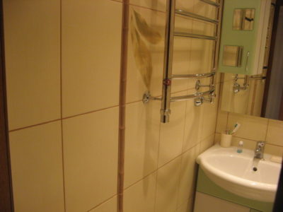 В ходе ремонта были полностью демонтированы устаревшее сантехническое оборудование и отделка с поверхностей. На стены и полы в помещениях уложена керамическая плитка оливкового цвета, а потолок выполнен из пластиковых панелей. Привнести в дизайн нотку элегантности удалось за счет укладки декоративных элементов с имитацией под бамбуковое дерево.