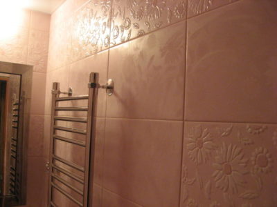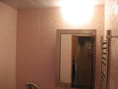 Наша компания выполнила капитальный ремонт ванной комнаты в квартире, расположенной на Звездном бульваре. В ходе работ были полностью демонтированы старые трубы, отделка и сантехника. Для облицовки стен использовались два типа керамической плитки розового цвета: с глянцевой поверхностью и фактурным рисунком. В целях экономии места были установлены подвесной умывальник и лаконичный полотенцесушитель. Ванна смонтирована слева от мойки. На стене над раковиной расположено стильное зеркало. Потолок оформлен пластиковыми панелями, около входа повешен аккуратный светильник с простым плафоном. Стоимость черновых материалов — 19800 руб. Цена работ под ключ — 73000 р.