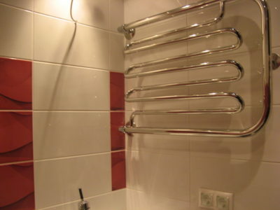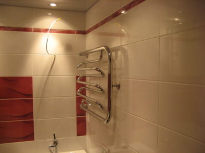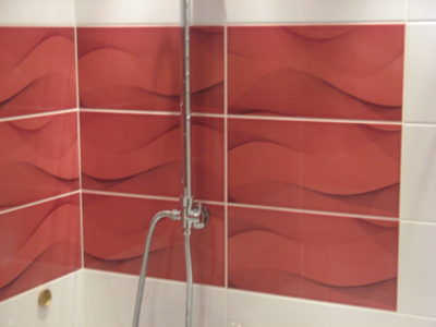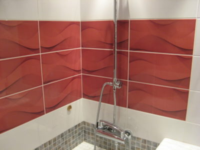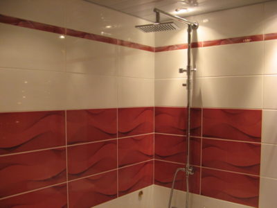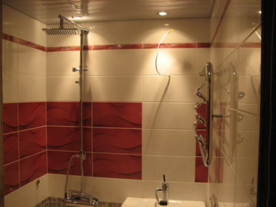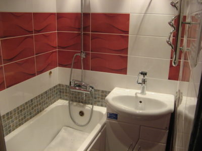 Наша компания выполнила капитальный ремонт ванной комнаты в квартире на улице Люблинской. Для полного обновления интерьера и проведения инженерных коммуникаций нами был проведен комплекс демонтажных и ремонтно-отделочных работ. В результате в маленьком помещении установлены умывальник с тумбой, небольшая акриловая ванна с многофункциональным душем и полотенцесушитель. Чтобы помещение выглядело ярко и неординарно, для облицовки поверхностей мы выбрали неожиданное сочетание белого, красного и приглушенно зеленого цветов. На пол уложена темно-зеленые плиты, выгодно контрастирующие с общим интерьером. На подвесном потолке смонтирована система точечного освещения. Общий бюджет ремонта составил 73600 рублей. Черновые материалы — 19100 р.