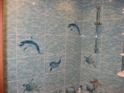 Главным достоинством дизайна при ремонте ванной комнаты в Химках стало декорирование стен керамической плиткой с изображением дельфинов, черепах и других обитателей моря. Мы выполнили отделку стен и пола кафелем нежно-голубого цвета с белыми прослойками. Установили подвесной потолок из пластиковых панелей со встроенными точечными светильниками. Мы смонтировали в комнате ванну с защитным экраном, мойдодыр и электрический полотенцесушитель. Бюджет ремонта составил 64 тысячи рублей. Черновые материалы — 24 тыс. р.