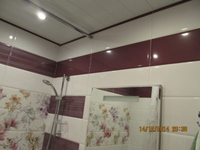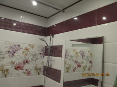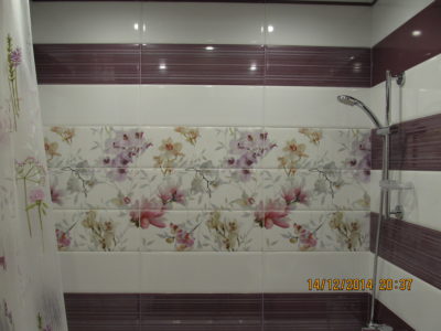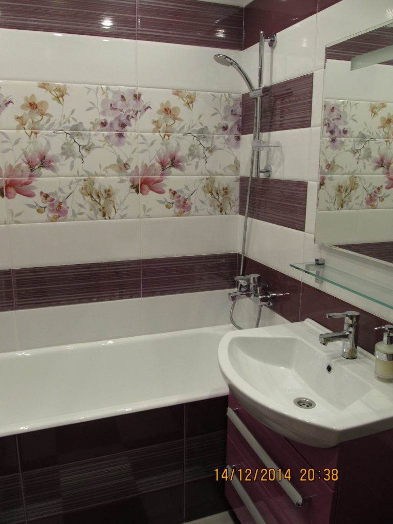 Для воплощения дизайнерской идеи при ремонте ванной комнаты на улице Чертановская была закуплена керамическая плитка с глянцевой поверхностью двух контрастных цветов. Смелое сочетание белого и бордо позволило создать в помещении камерную обстановку, а декоративное панно из кафеля с цветочным принтом придало композиции дополнительного шарма. Мы установили реечный потолок и вмонтировали в подвесную конструкцию точечные светильники. Для создания целостного ансамбля по краям потолка смонтирована темно-коричневая лента, а для обработки швов использовалась двухкомпонентная затирка с блестками. Из сантехники установлены ванна, умывальник с тумбой и полотенцесушитель. Также мы подключили стиральную машину, смонтировали шкаф для хранения кухонных принадлежностей и закрепили на стене держатель для душа. Цена ремонте – 73500 тысяч рублей. Стоимость расходных материалов – 20 тыс. руб.